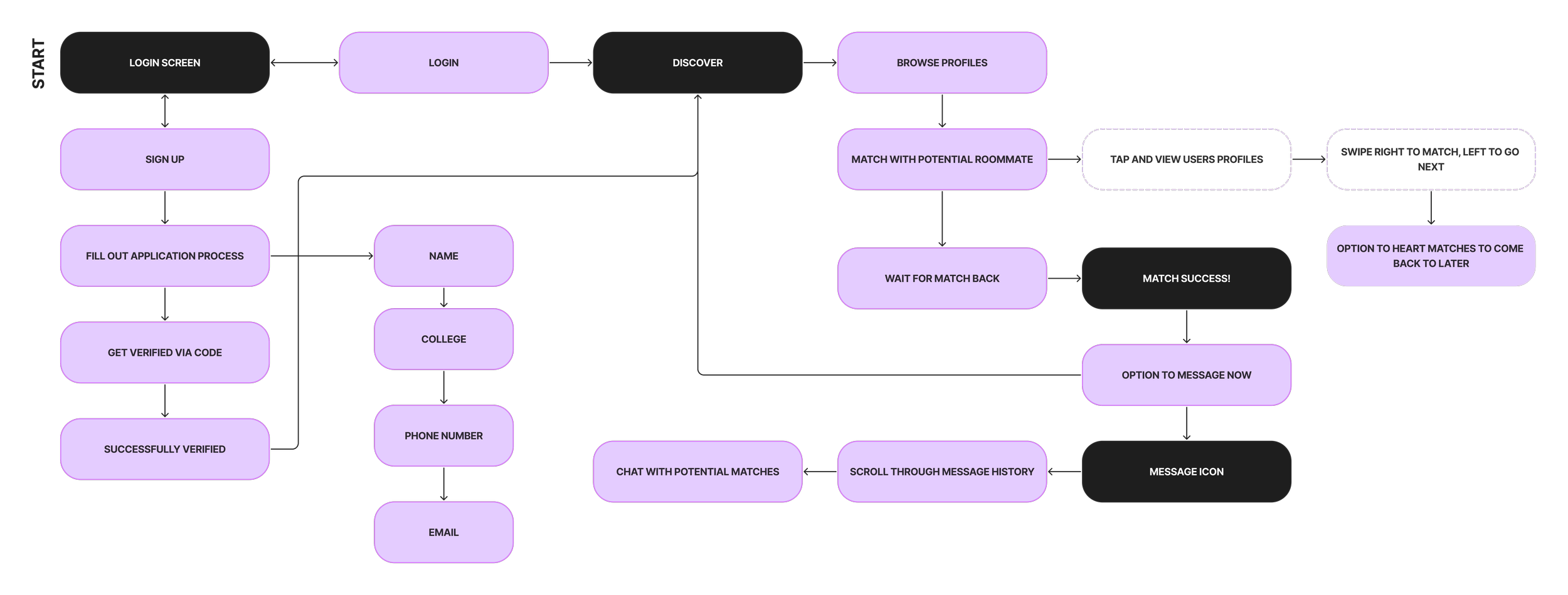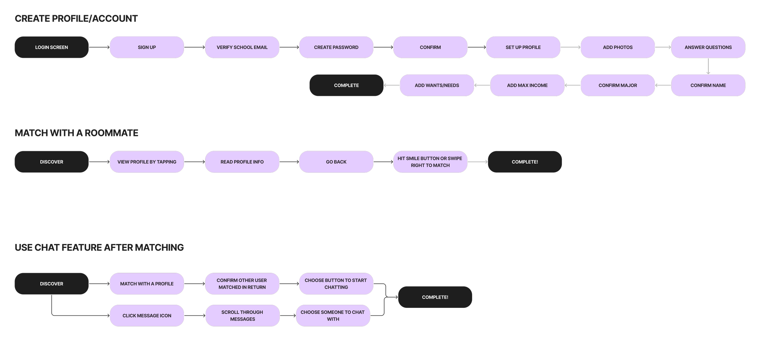 User interviews were conducted with 7 participants ranging from incoming freshman to senior college students. My goal was to gain insights on their pain points, stressors, and overall experiences when preparing to move into a new apartment and looking for a roommate.