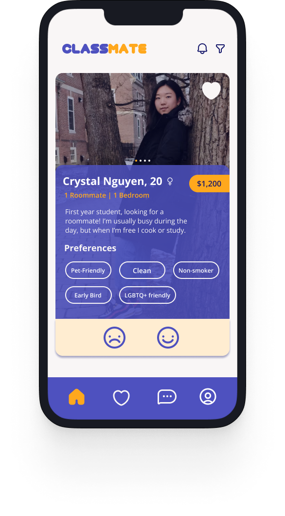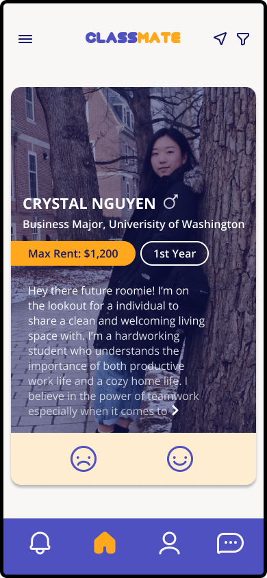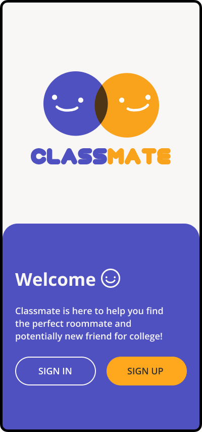 Based on user feedback, and competitive analysis research, users have a hard time trusting resources due to potential risks of getting scammed. I selected a color palette with yellow-orange, and blue hues to convey trust and reliability. The name “Classmate” was used to indicate the app’s intentions of targeting college students as the main audience.