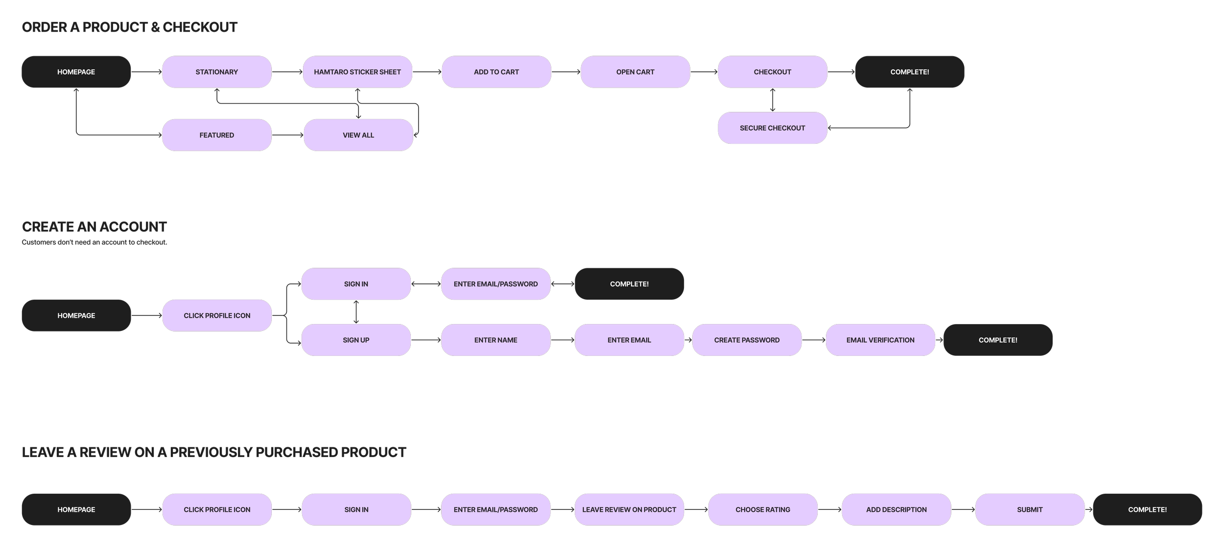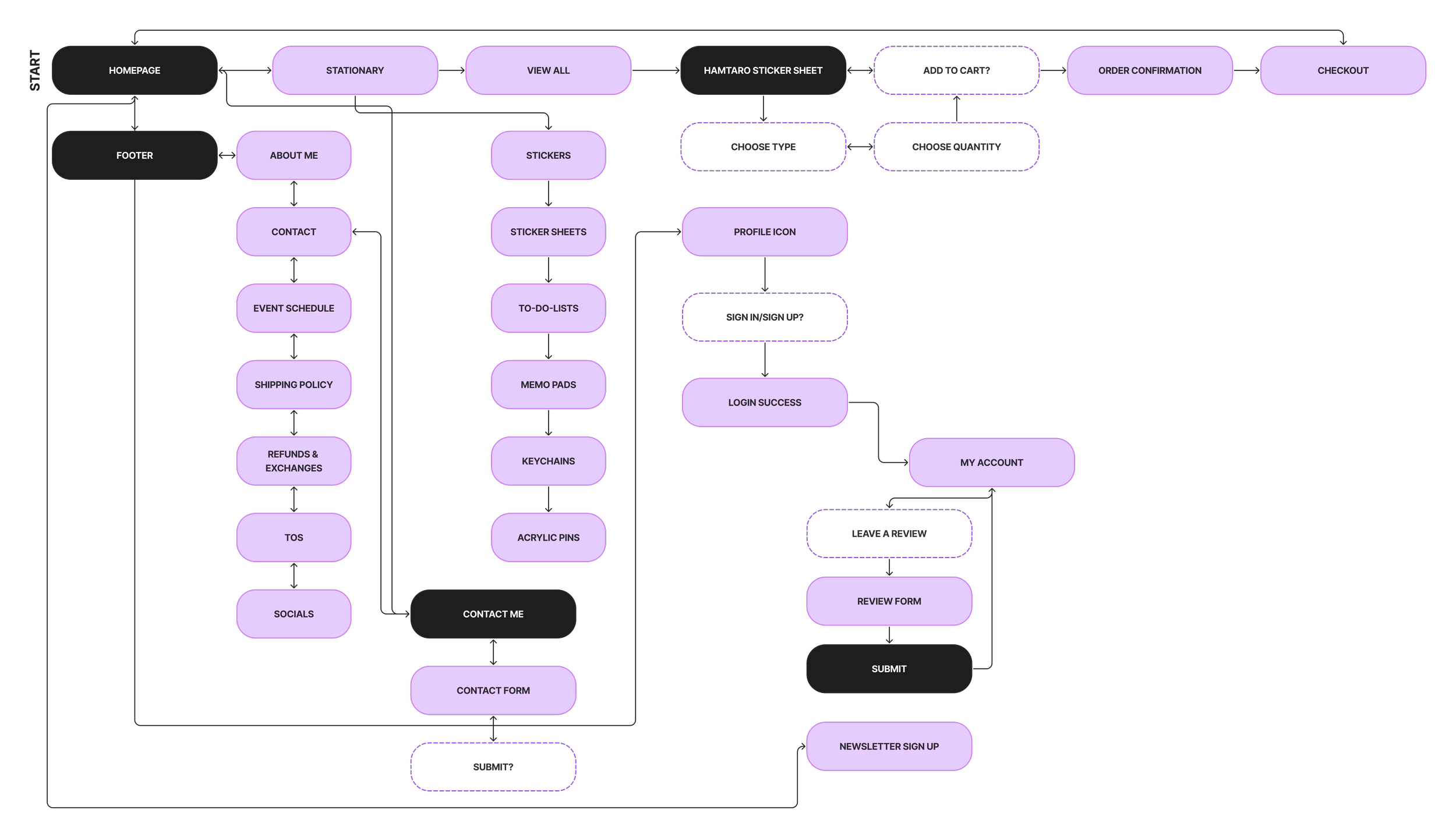 Before beginning the wireframing process, I created user flows and task flows to map out how users would navigate the site. My goal is to outline each feature, define how user’s would navigate through the site, and identify potential roadblocks.