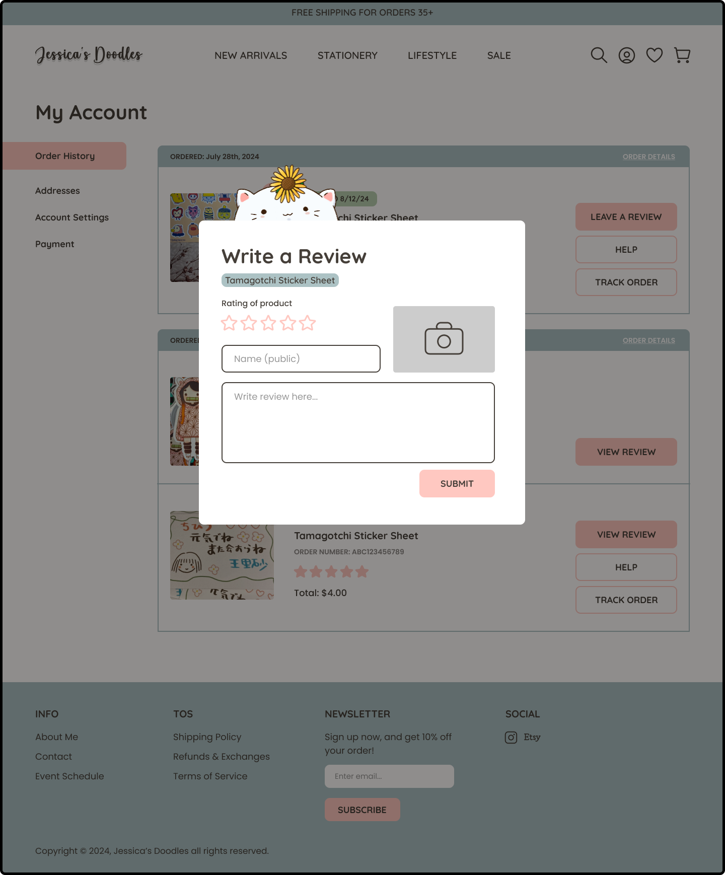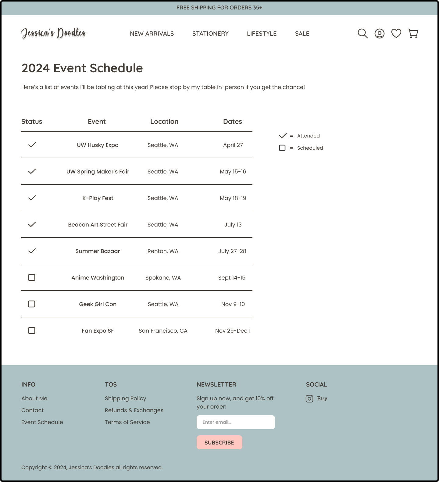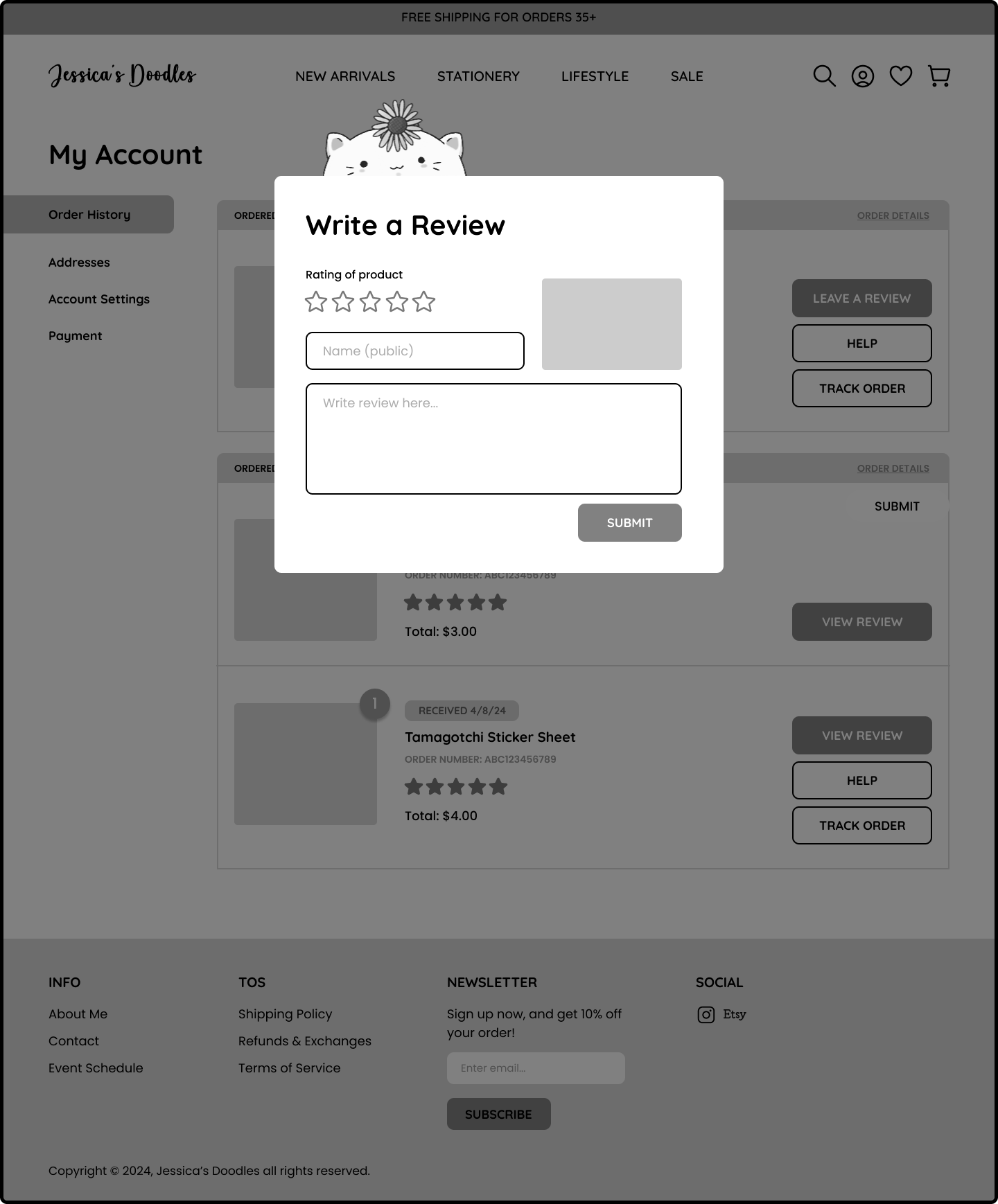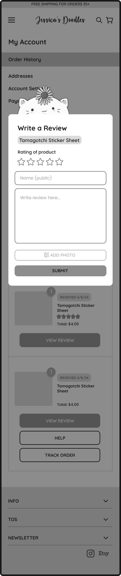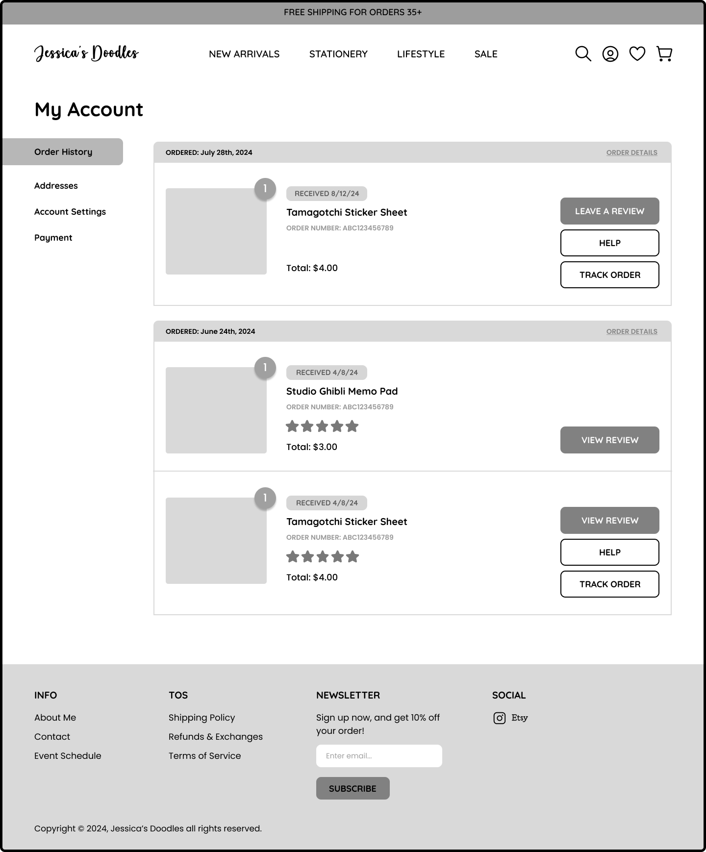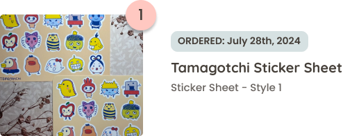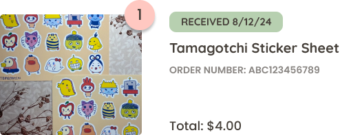 I removed the “Received” status, and replaced it with the order date to reduce confusion, per artist’s request. Added brief descriptions to past orders to specify the items included in each order.
